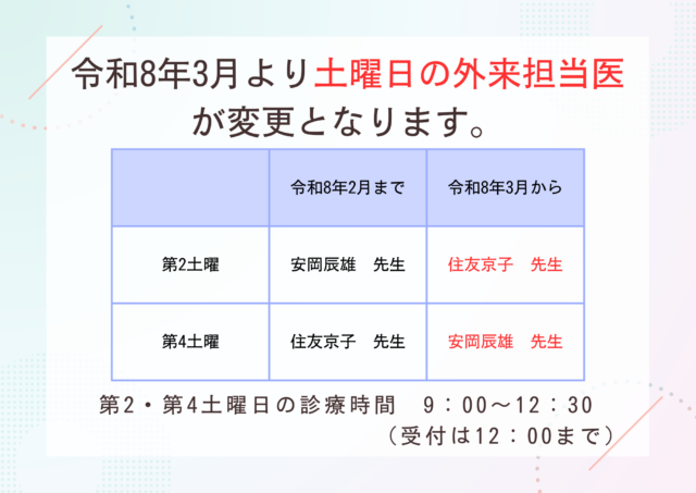 お知らせ 外来担当医の変更のお知らせ 令和8年3月より土曜日の外来担当医が変更となります。 第2土曜:安岡辰雄 先生 → 住友京子 先生 第4土曜:住友京子 先生 → 安岡辰雄 先生 ご迷惑をおかけしますが、何卒よろしくお願いいたします。 2026.01.26 お知らせ